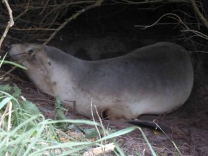 Ich bleibe auf Abstand und begebe mich danach wieder zu meinem Auto. Oh ja, der Weg ist anstrengend – ich gehe bergauf im weichen Sand – 50 cm hoch, rutsche 30 cm wieder runter. Doch irgendwann komme ich an, zwischendurch viele Pause und eine Überraschung: da liegt in einer Dünenhöhle direkt neben dem Weg ein kleiner Seehund.