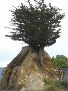 Ich lasse mich von Mrs. Google aus der Stadt leiten, werde bald unfolgsam, weil ich die Scenic-Route an der Küste vorziehe – mit wieder wunderschönen Aussichten, zumal die Sonne sich allmählich blicken lässt! Zum Schluss bin ich dann die letzten Kilometer wieder auf der Hauptstraße und erreiche die kugeligen Steine, bisher aber noch bei Flut. Sie sind trotzdem gut erreichbar, liegen im Wasser, so dass man sie nicht vollständig sieht. Witzig sind sie trotzdem, wie sie so rund im Pazifik liegen, der ansonsten ja nur recht unförmige Felsen beherbergt. Auch ich ziehe bald meine Schuhe aus und gehe durchs Wasser, teilweise durch glitschigen Schlick und passe auf, dass ich nicht ausrutsche. Weiter im Wasser steht ein junger Mann, der seine Hose noch besonders nass macht. Er reibt drauf herum, ich vermute, er wurde von einer Möwe getroffen, nicht ganz selten in dieser Gegend. Oder er braucht eine Erfrischung, ich werde es wohl nicht erfahren.