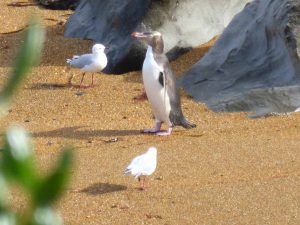 Zunächst bin ich noch alleine, dann sehe ich noch ein Pärchen. So gerne ich alleine in der Natur bin, so ein, zwei Menschen in der Ferne hat etwas Beruhigendes. Am Ende des Strandes treffe ich dann mal wieder auf einen Seelöwen, den ich fast übersehe, so fügt er sich ins Bild mit den Steinen ein. Wie ein großer sandiger Fels liegt er da und stört sich nicht daran, dass er als Fotomodell fungiert. Ich gehe zurück und sehe auf der letzten Düne sich etwas bewegen. Das kann eigentlich nur ein Pinguin sein. Ich eile, denn ich möchte ihn gern fotografieren, bevor er in seinem Versteck verschwunden ist. Es ist wieder ein Gelbaugenpinguin, ich hätte ja lieber einen blauen gesehen. Nichtsdestotrotz, es ist immer wieder ergreifend, diese goldigen Tiere zu sehen!