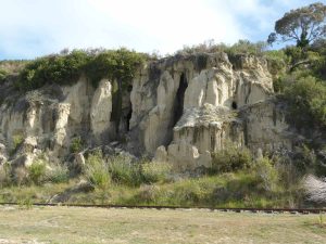 Weil ich gestern Abend erfuhr, dass die runden Steine, die Moeraki Boulders nur bei Ebbe richtig zu sehen sind, stellte ich mir am Abend den Wecker, um rechtzeitig hier loszufahren. Fahrzeit eine Stunde, Ebbe um 9:00, vorher noch den Tunnel Beach ansehen, also halb acht hier spätestens los. Wenn ich etwas später bei den Steinen bin, ist es ja nicht schlimm, denn bis zur Flut dauert es immerhin 6 Stunden. Schon vor sieben bin ich wach und ausgeschlafen, dusche rasch und mache mir nur ein kleines Frühstück. Es ist relativ grau, aber immerhin trocken. Schnell noch die Wasserflaschen aufgefüllt und los geht es. Der Tunnel Beach liegt direkt bei Dunedin, der Weg dahin spannend. Während die Straße ja erst nur an der Küste von meiner Halbinsel wegführt, geht es gleich danach nur noch bergauf, recht steil und immer durch Wohngebiete. Unglaublich, dass solche Gefälle beim Bauen überwunden werden können! Schon bald bin ich da, inzwischen regnet es und so wirklich aussteigen mag ich gar nicht. Kalt und nass, nicht gerade das Traum-Strand-Wetter. Aber wenn nicht jetzt, dann nie, und das geht nun gar nicht.