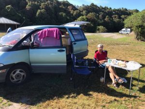 Auf dem Campingplatz können wir diese Nacht nicht bleiben, aber 10 km weiter ist ein DOC-Campground, superschön gelegen an einer Bucht und an einem Fluß, an den wir uns stellen. DIe Sandflies lieben diesen Platz aber auch – und so sitzen wir bald voll eingemümmelt da, damit wir kaum freie Haut haben, die angreifbar ist.